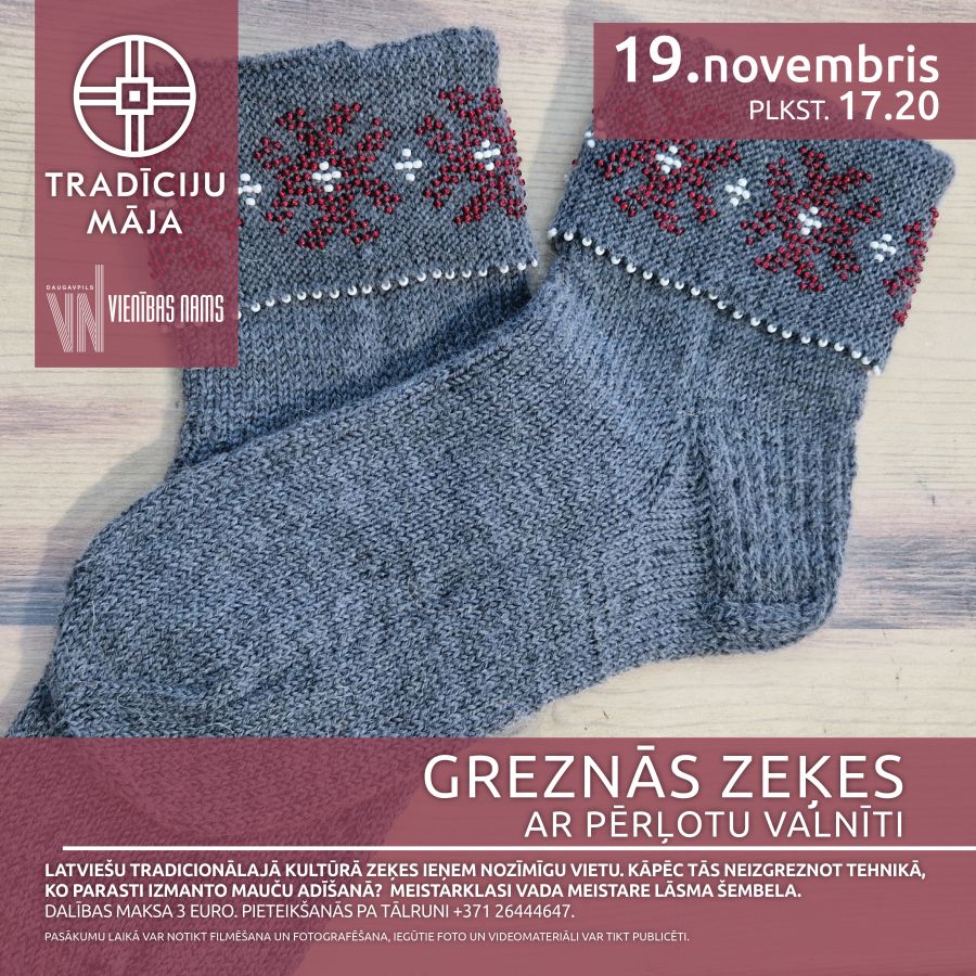 Latviešu tradicionālajā kultūrā zeķes ieņem nozīmīgu vietu. Kāpēc tās neizgreznot tehnikā, ko parasti izmanto mauču adīšanā? Meistarklasi vada meistare Lāsma Šembela.