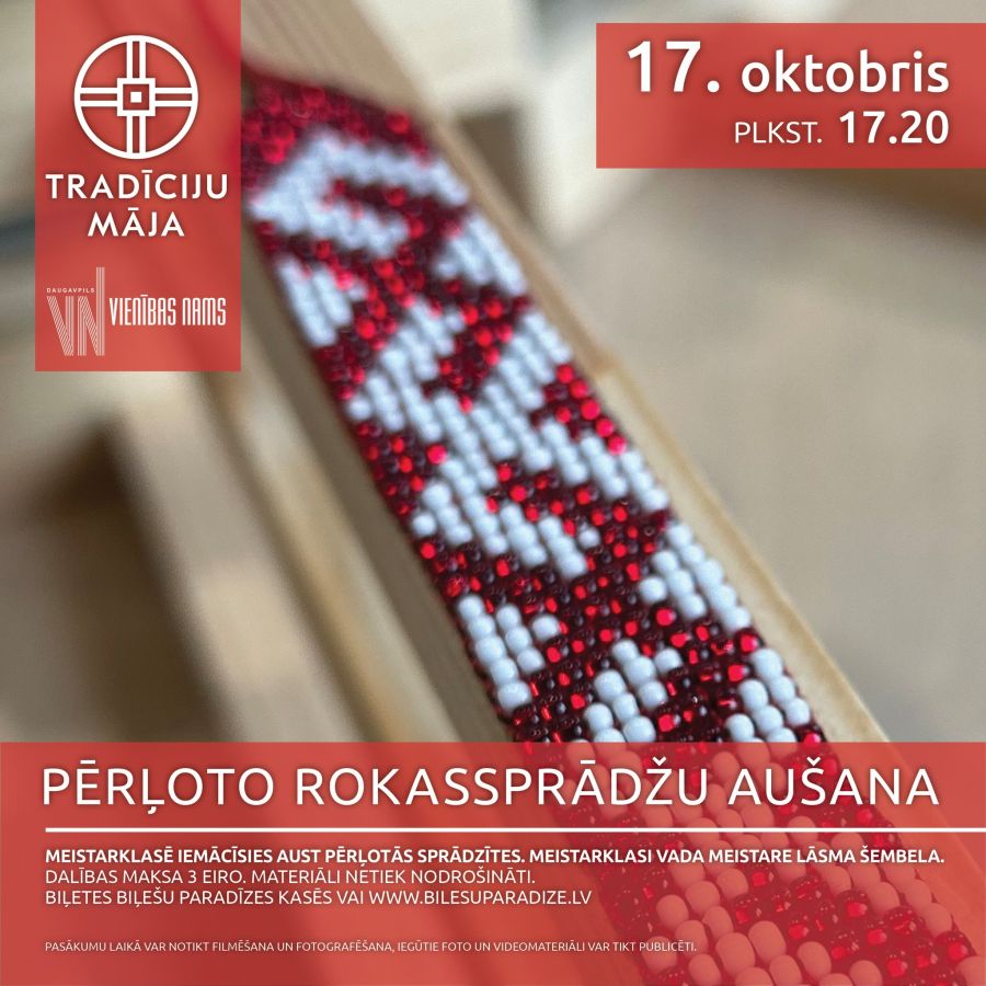 Meistarklasē iemācīsies aust pērļotās sprādzītes meistares Lāsmas Šembelas vadībā.