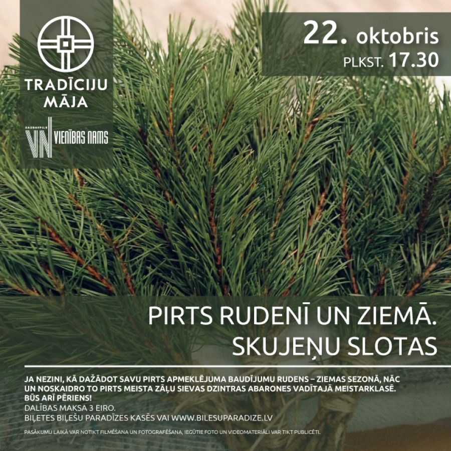 Pirts baudīšana ir aktuāla un aizraujoša jebkurā gadalaikā. Pavasara/vasaras sezonā aktīvi var izmantot dažādus augus, kokus un krūmus pirts slotās, skrubjos, pirts paklājumos. Taču ko darīt rudens/ziemas sezonā, kā dažādot savu pirts apmeklējuma baudījumu? Palīgā var nākt dažādi skuju koku produkti – slotiņas, skrubji, maskas. Meistarklasē būs iespēja pagatavot skujeņu slotiņu un noskaidrot, kā to izmantot