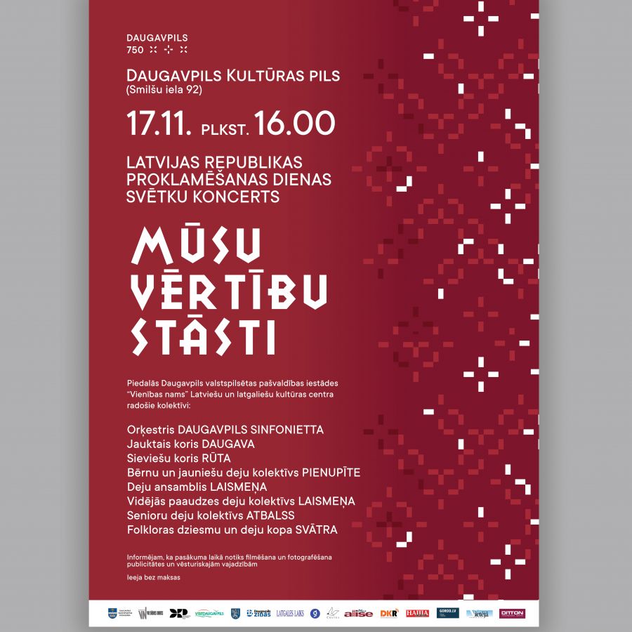 Šī gada 17. novembrī plkst. 16.00 Daugavpils Kultūras pilī (Smilšu ielā 92) notiks koncertuzvedums “Mūsu vērtību stāsti”, veltīts Latvijas Republikas proklamēšanas 107. gadadienai.