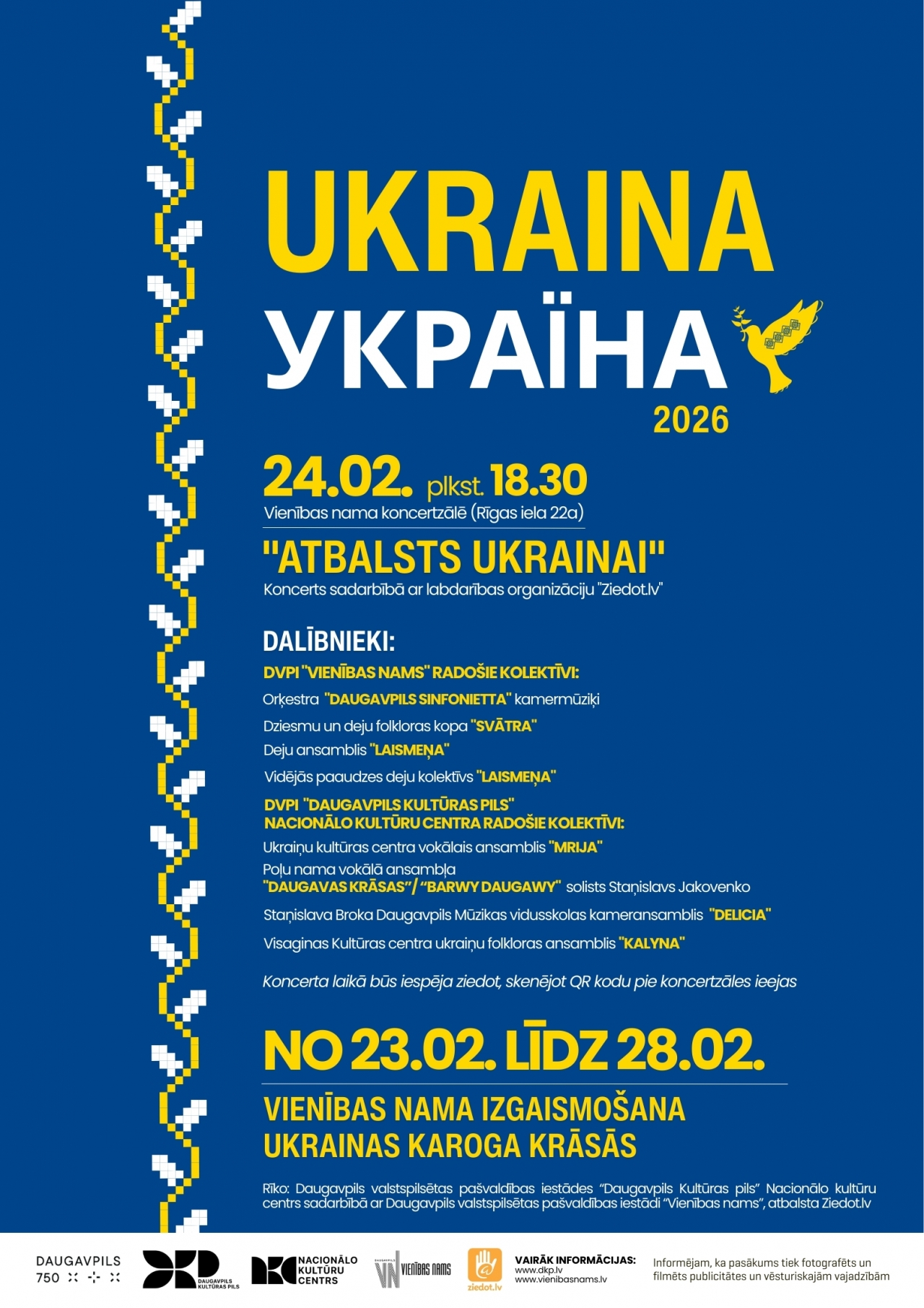 Daugavpils valstspilsētas pašvaldības iestādes “Daugavpils Kultūras pils” Nacionālo kultūru centrs sadarbībā ar Daugavpils valstspilsētas pašvaldības iestādi “Vienības nams”, organizāciju “Ziedot.lv” rīko labdarības koncertu “Atbalsts Ukrainai”.